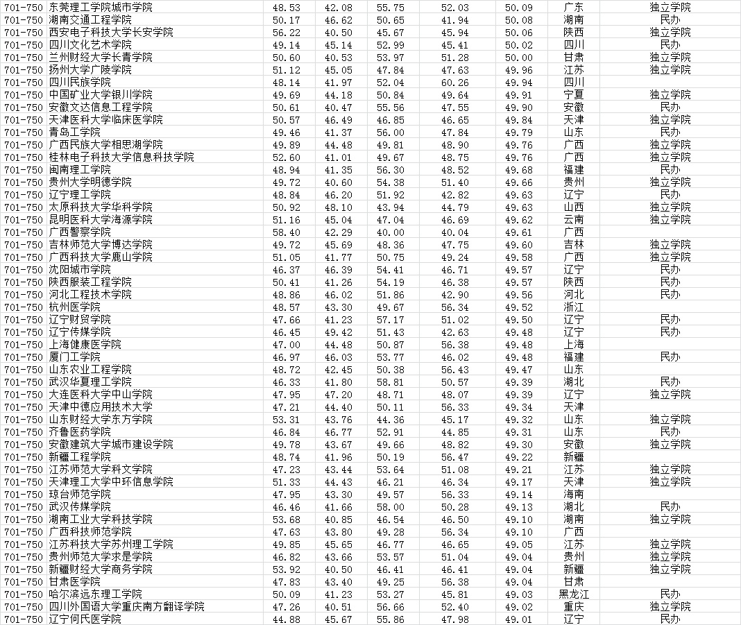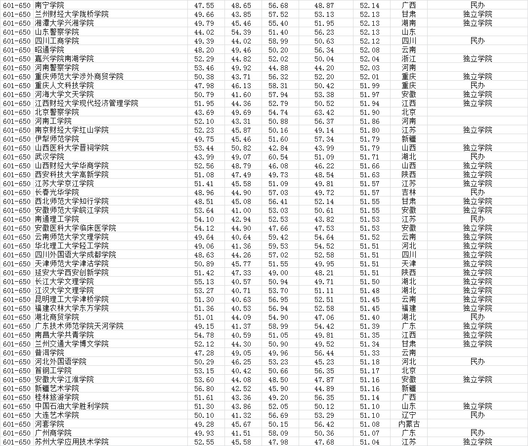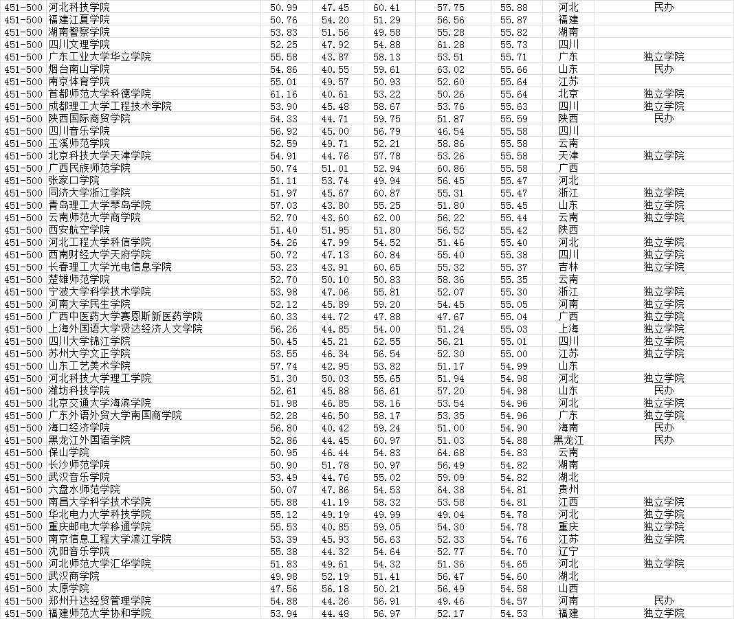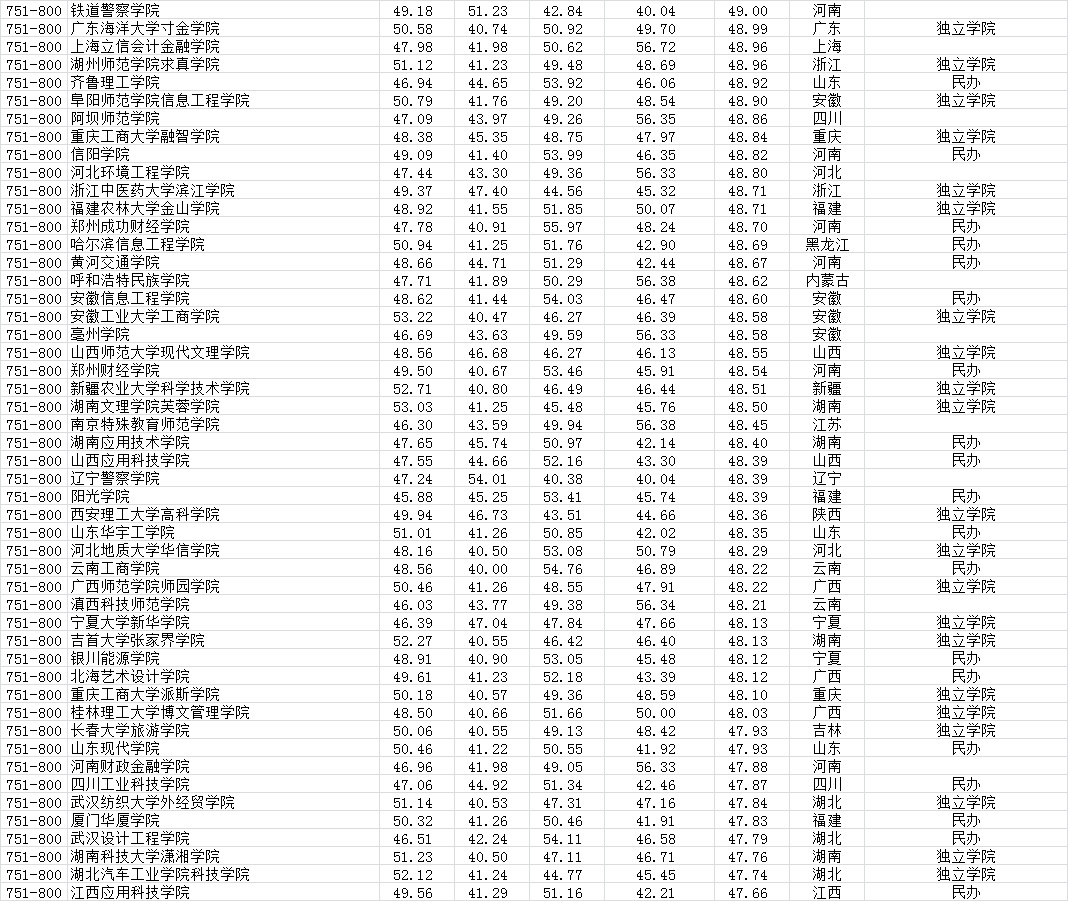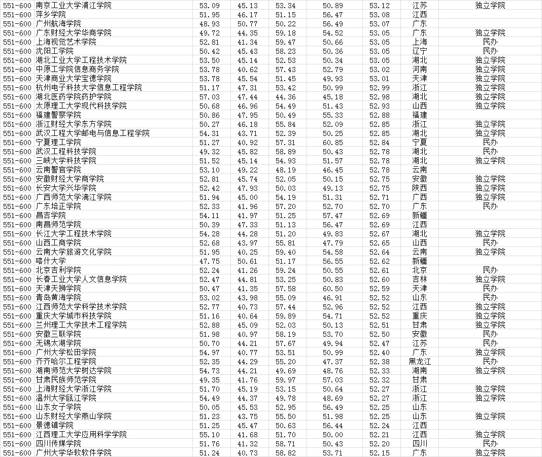 统计可以看出,进入800强的本科高校包括449所公办普通本科高校,209所独立学院,135所民办本科高校,5所中外合作办学高校,2所内地与港澳台合作办学高校。将独立学院、民办本科高校与公办普通本科高校进行同一指标体系下的评价是“2017广州日报应用大学排行榜”的最主要特点之一。从排名看,公办普通本科高校的排名大幅领先独立学院、民办本科高校,但随着近年独立学院、民办本科高校的办学实力不断增强,已成为一股不可小觑的办学力量。排名前100的高校中有三所非公办高校,其中中外合作办学的西交利物浦大学排名第46;宁波诺丁汉大学居65位,浙江大学城市学院作为一所办学质量不断提高的独立学院,位居第81名。