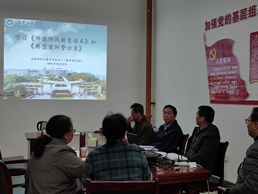 10月22日上午,高教研究与教学评估中心(教学督导团)全体人员在教学楼B103开展了师德师风教育专题学习,黄先威主任主持会议。