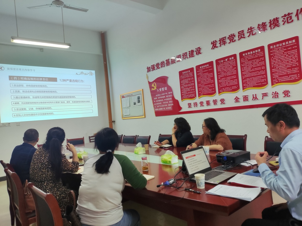 2023年4月28日,在教学楼B103会议室,高教研究与教学评估中心党支部全体党员开展了“学保密 知保密 懂保密”主题党日活动。党支部书记黄先威宣读了《中华人民共和国保守国家保密法》《中华人民共和国国家安全法》等相关文件;详细讲授了当前高校保密工作的严峻形势、保密的相关知识、新保密法的内容学习、新形势下做好高校保密工作的对策和建议。